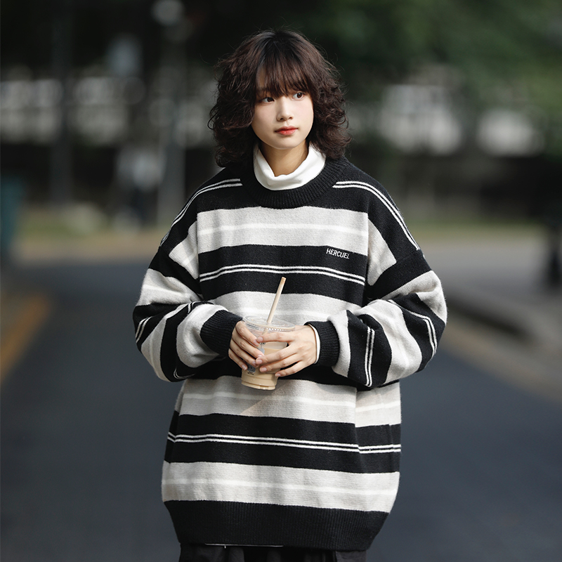 日系复古慵懒风条纹套头针织毛衣女秋冬小众高级感宽松小个子上衣