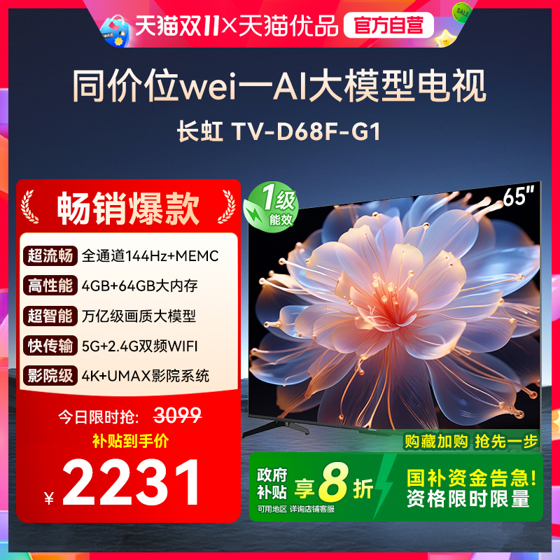 【政府补贴20%】长虹65D68F-G1 65英寸智能网络电视4K超清官方55