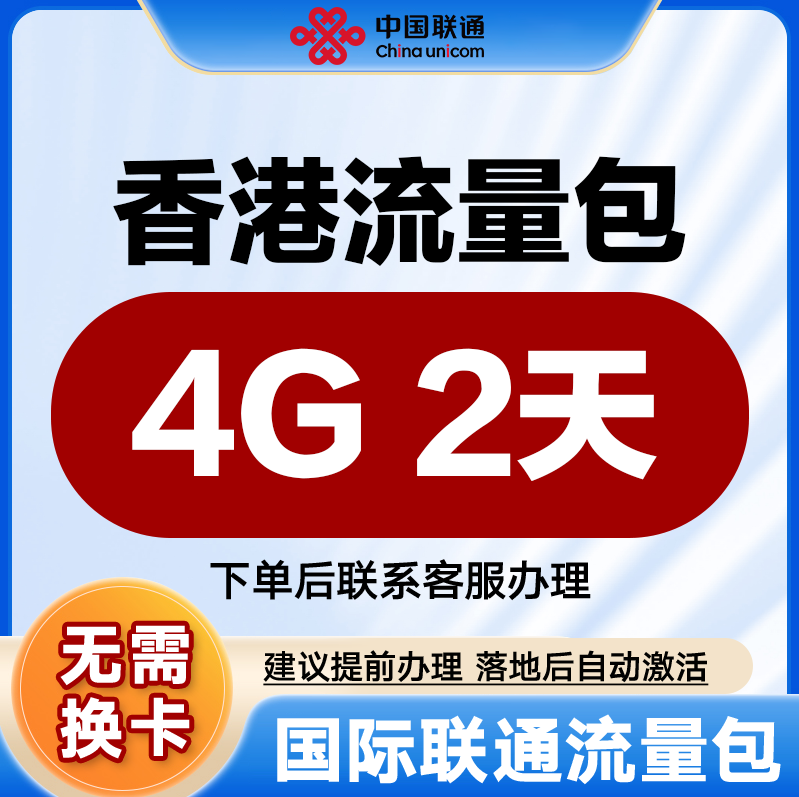 中国联通国际漫游流量 香港2天4G流量充值境外上网流量包无需换卡