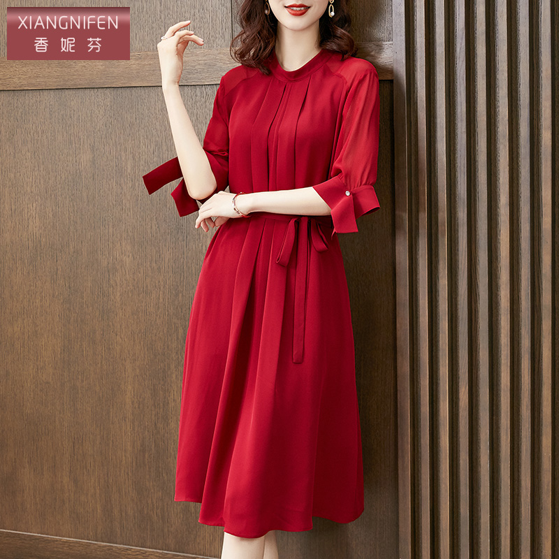 香妮芬红色高端精致重磅真丝阔太太贵妇人连衣裙2025新款夏季气质