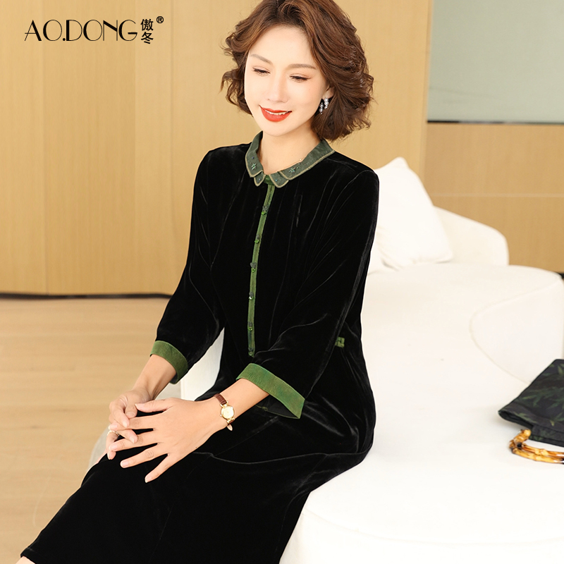 重磅真丝丝绒连衣裙女刺绣新中式桑蚕丝妈妈收腰高贵裙子气质春秋