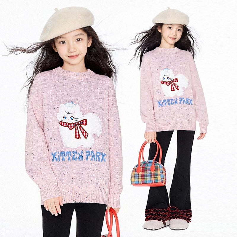 MSYJ 可爱猫咪刺绣针织衫女童秋冬加厚长袖圆领毛衣休闲上衣套头