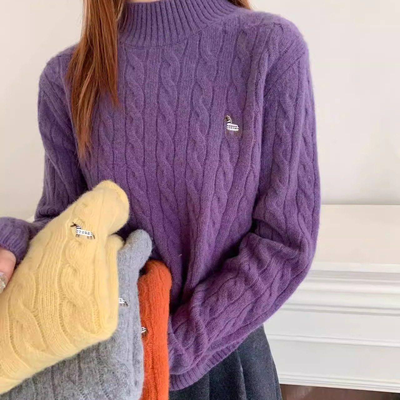辰米范 自由贝拉 学院风刺绣圆领长袖毛衣女慵懒麻花套头针织衫