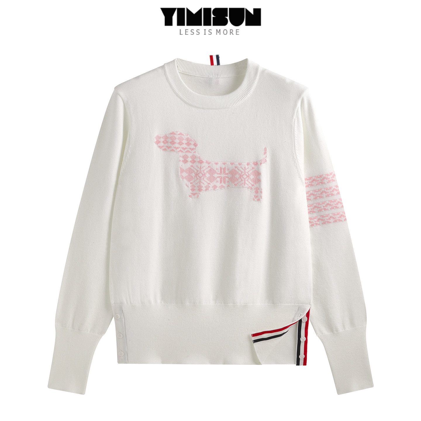 YIMISUN新款彩色小狗刺绣圆领套头毛衣女长袖针织衫白色打底衫潮