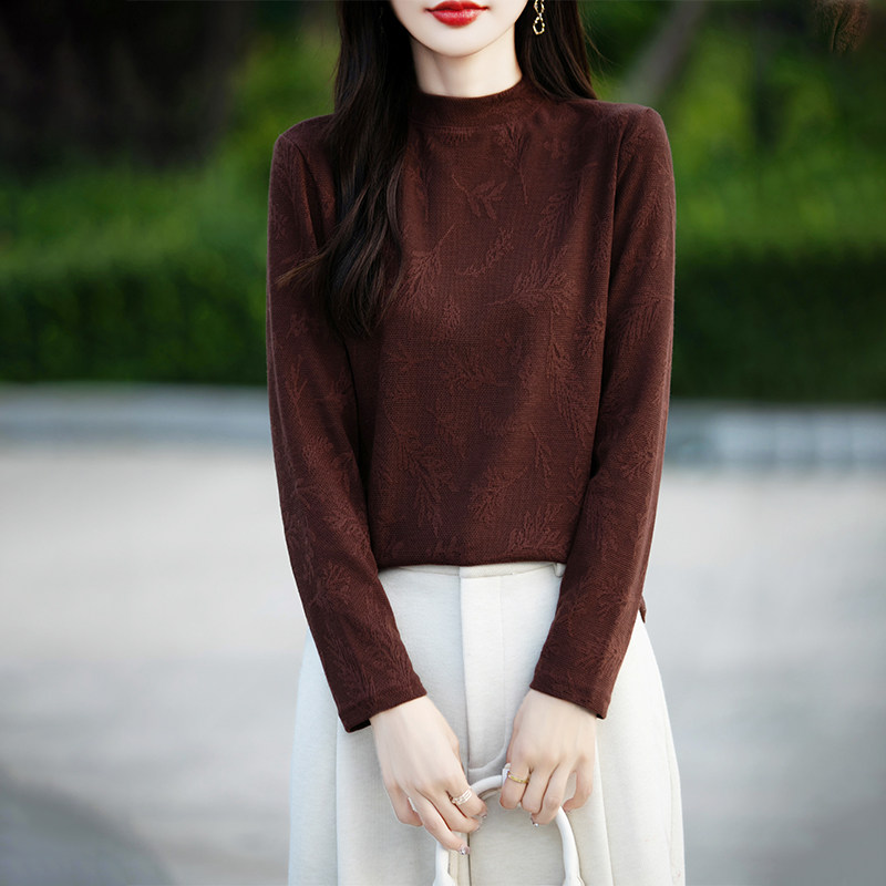 长袖t恤女秋套头半圆领长袖内搭打底衫洋气休闲显瘦刺绣针织上衣