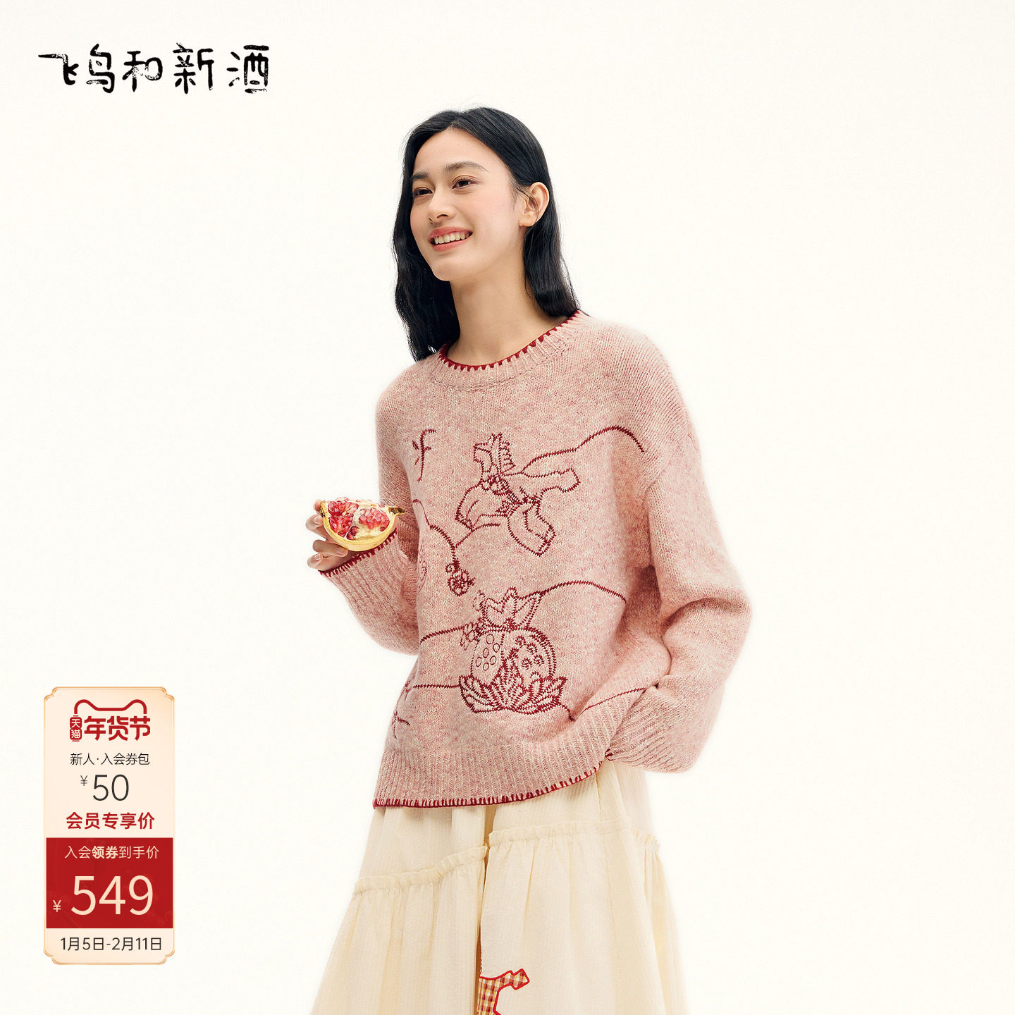 飞鸟和新酒绣花圆领长袖毛针织衫女套头2026春季新款粉色宽松毛衣