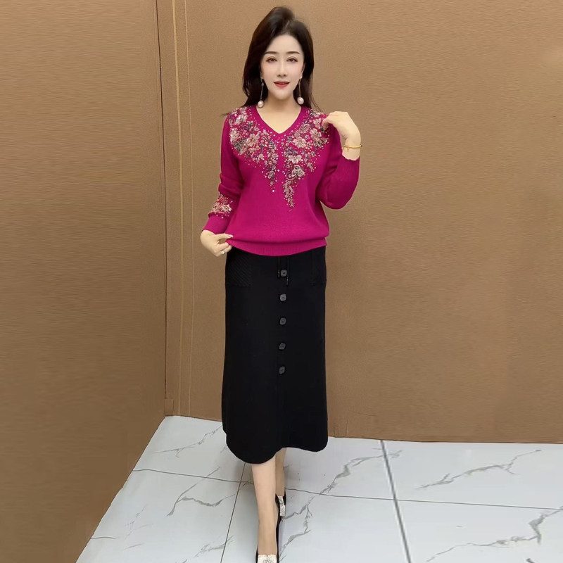 国风重工刺绣花V领钉珠套头针织衫女洋气中年妈妈款长袖焦麻上衣