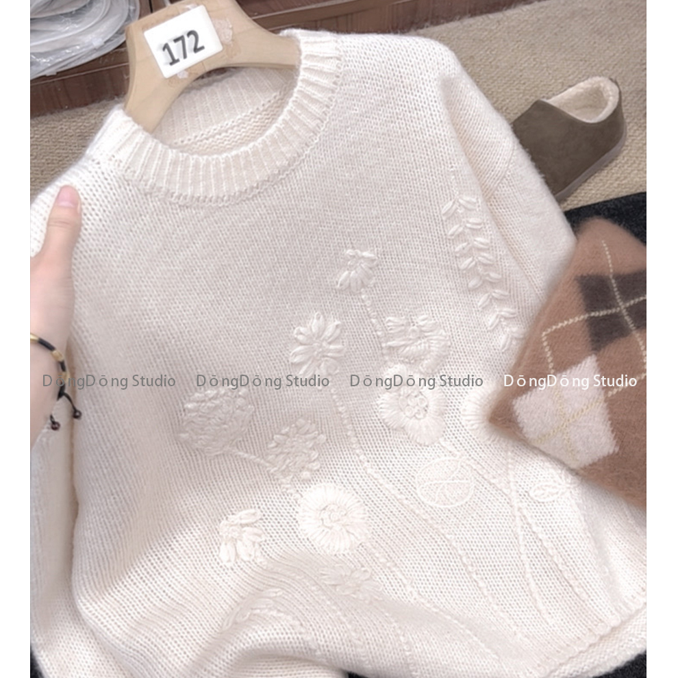 三万针刺绣![莫奈花园]圆领套头绣花宽松长袖针织衫女士毛衣9036