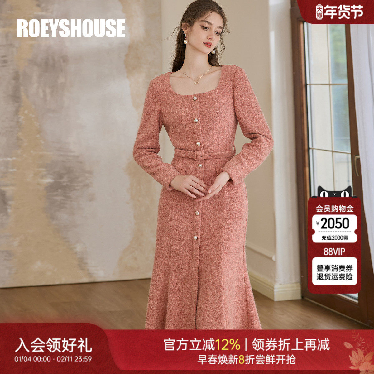 罗衣高级方领鱼尾摆连衣裙2025冬季新款法式修身毛呢中长裙11489