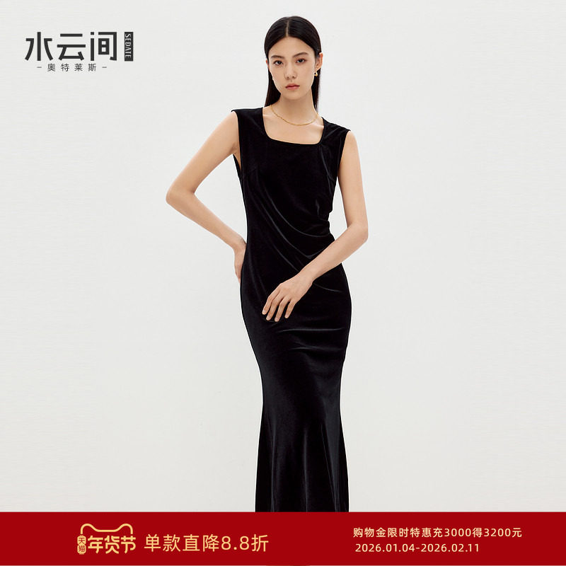 水云间黑色方领丝绒连衣裙女小鱼尾中长款宴会礼裙子设计感2025秋