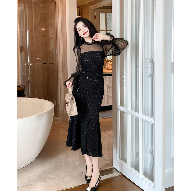 法式优雅春秋季新款高端小众设计感鱼尾中长裙蕾丝亮片修身连衣裙