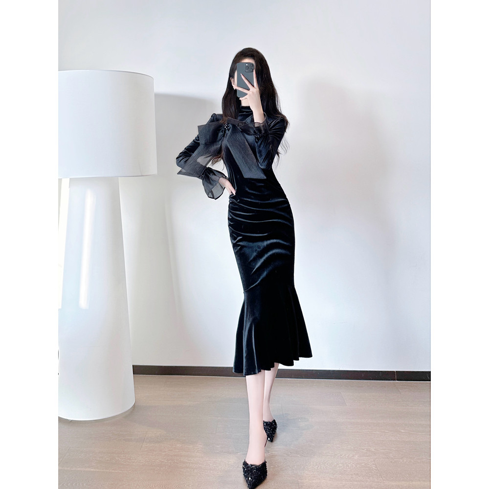 黑色丝绒连衣裙2024新款女秋冬高级感气质名媛蝴蝶结中长款鱼尾裙