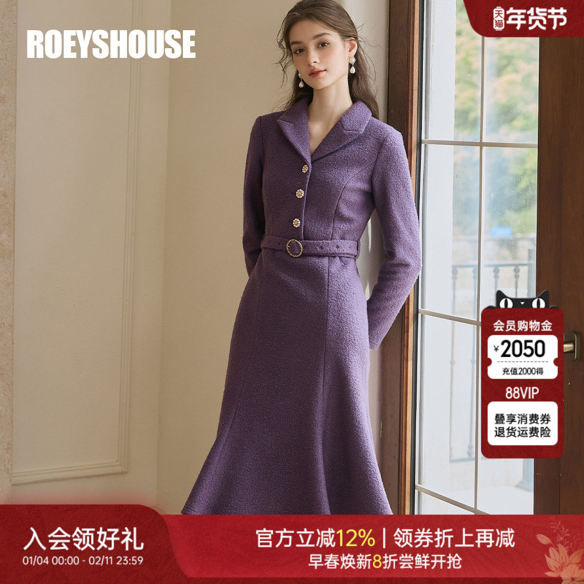 罗衣高级鱼尾毛呢连衣裙2025冬季新款法式小香风系带中长裙11491