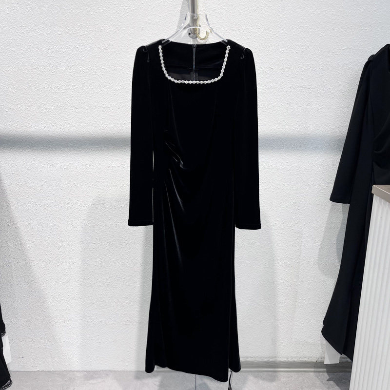 法式丝绒连衣裙女2025年秋冬季新款珍珠领长袖鱼尾裙洋气中长款裙