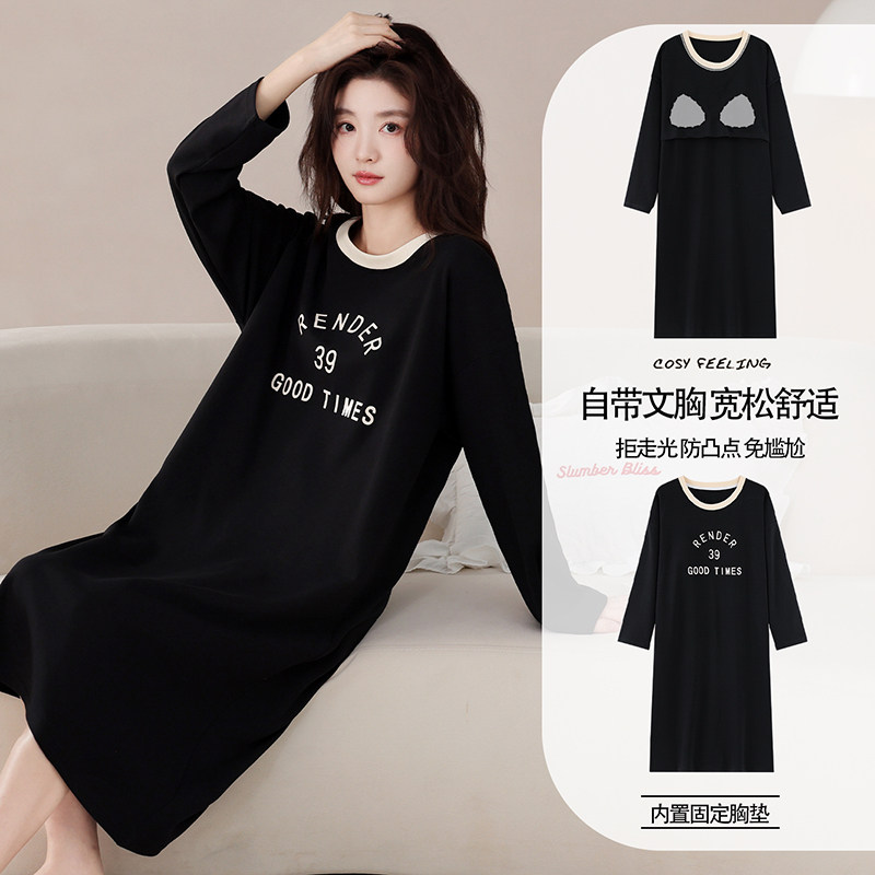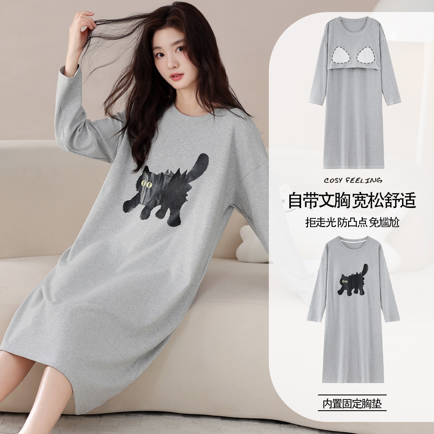 带胸垫纯棉长袖睡裙女款春秋季宽松加大码休闲可外穿家居服连衣裙