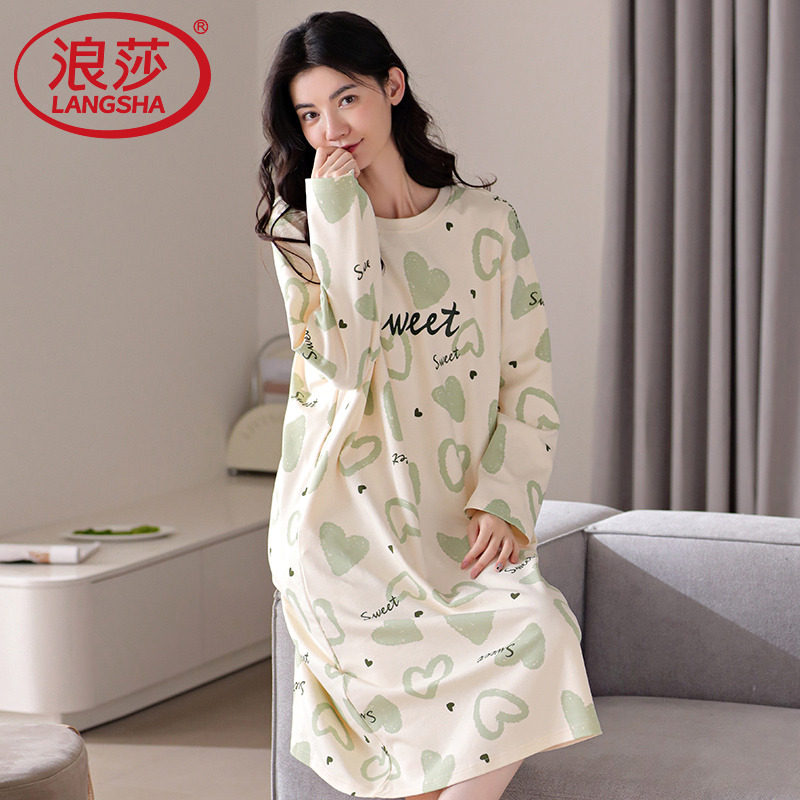 浪莎睡裙女春秋季长袖纯棉大码可爱睡衣家居服全棉女款孕妇连衣裙