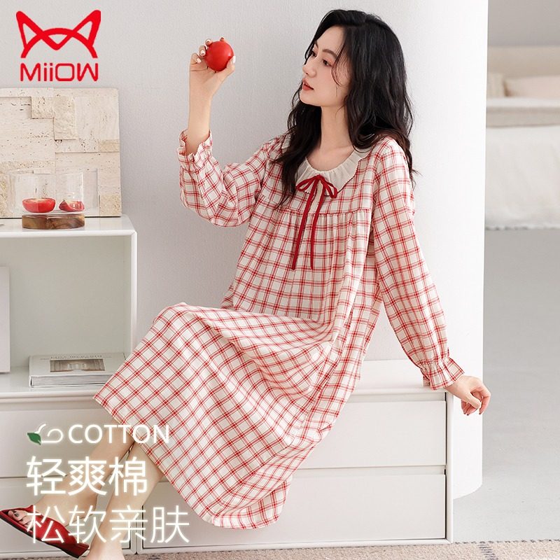 猫人睡裙女款春秋2025新款纯棉长袖秋季女士梭织棉纱布大码连衣裙