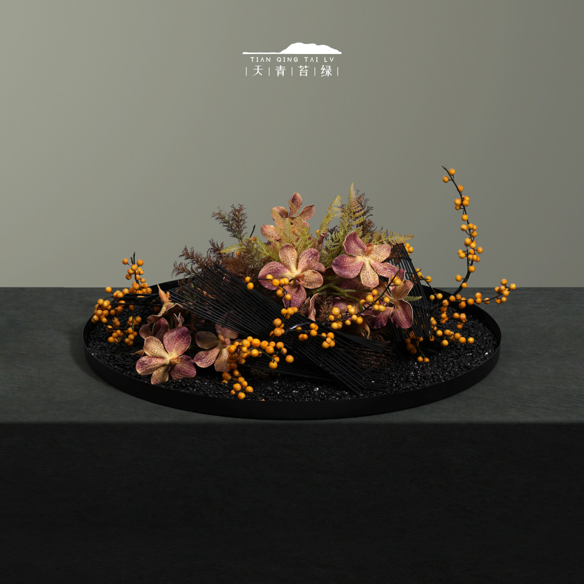 天青苔绿 新中式酒店圆桌金属仿真花摆件 大堂餐桌景观造景软装