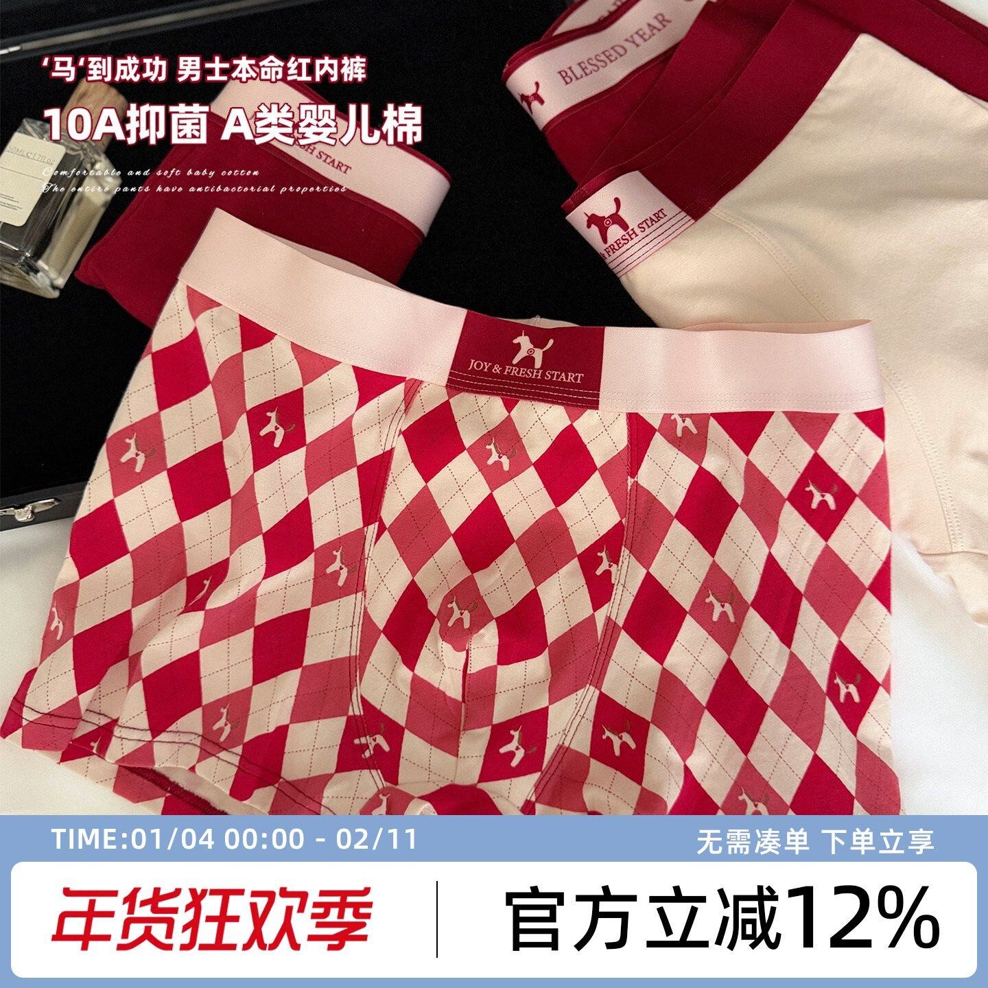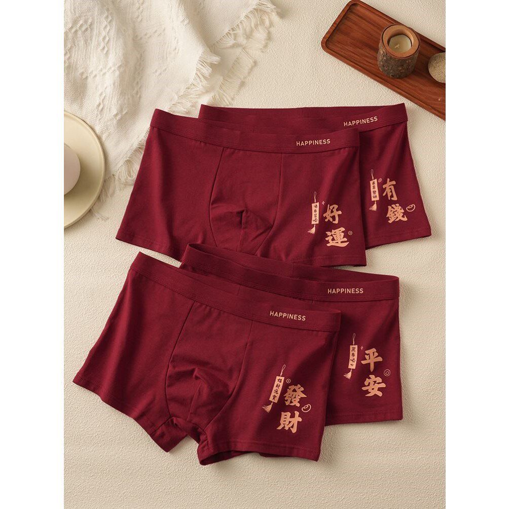 10A抑菌吉言印花红内裤棉质酒红色男士内裤元旦马年喜庆平角裤