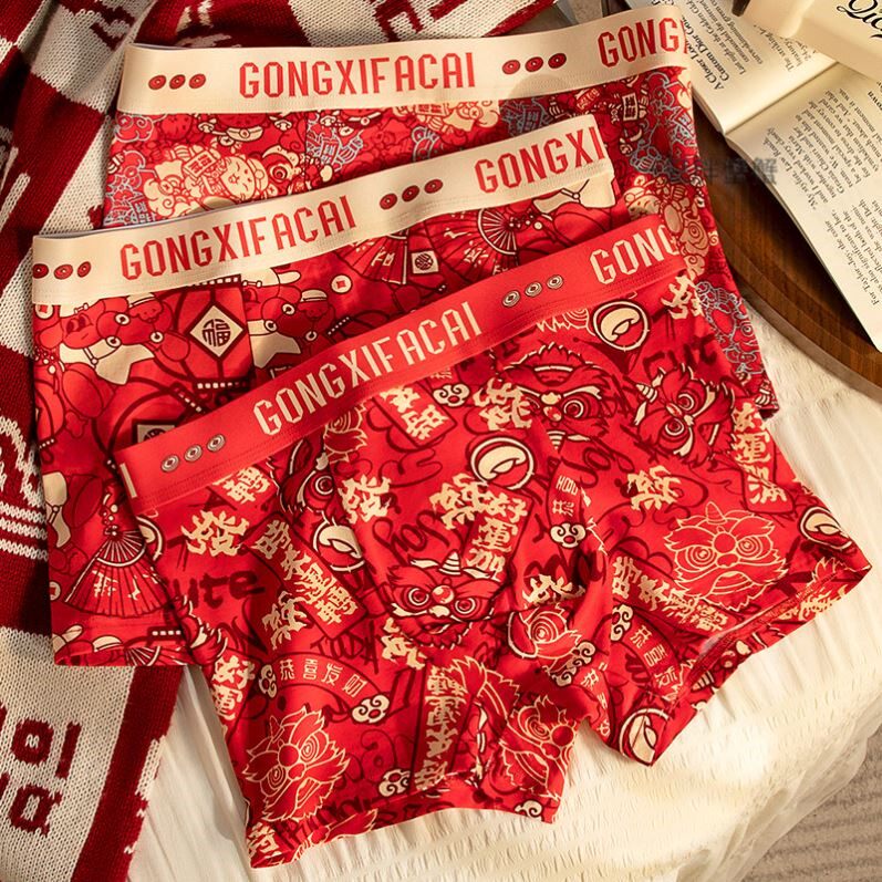 本命年有钱好运过年喜庆纯棉印花潮牌透气结婚四角短裤头男士内裤