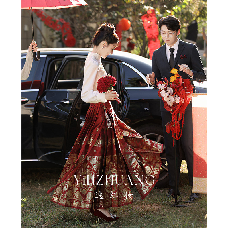 中式红色旗袍女冬装刺绣订婚礼服国风敬酒服连衣裙金梅报喜倒大袖
