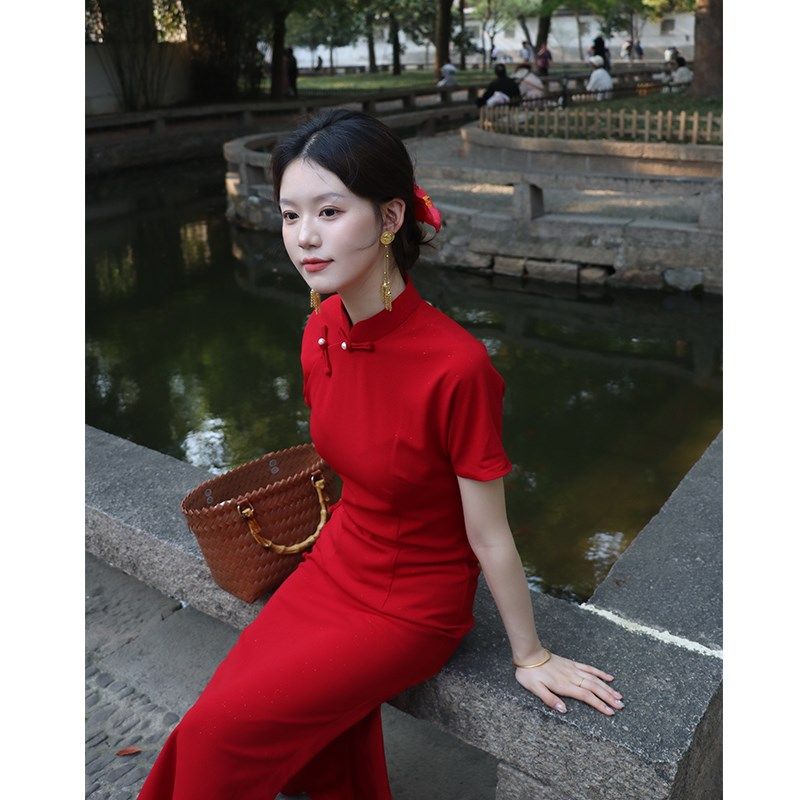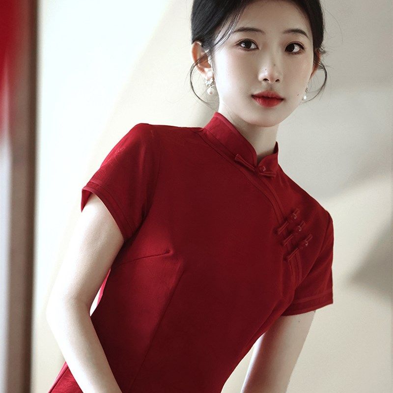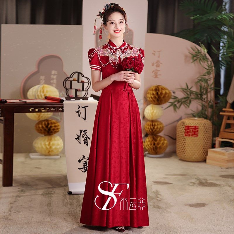 敬酒服旗袍新娘复古晚礼服答谢宴2023新款夏季长版回门酒红色修身