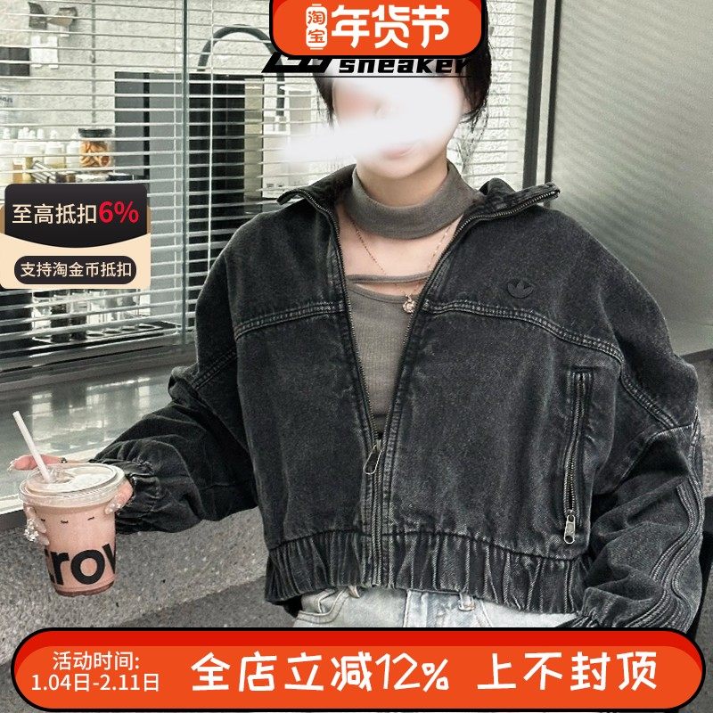 阿迪达斯三叶草女款复古短款宽松牛仔翻领运动休闲外套IW5762