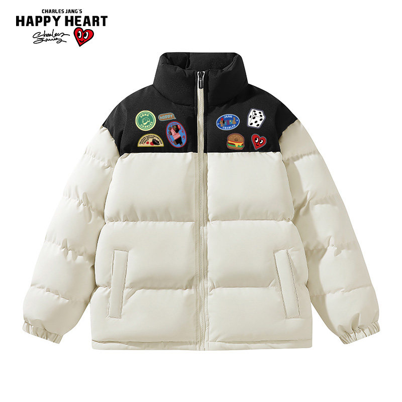 查尔斯桃心美式贴图印花立领拼色棉衣男女冬季加厚学院风情侣外套
