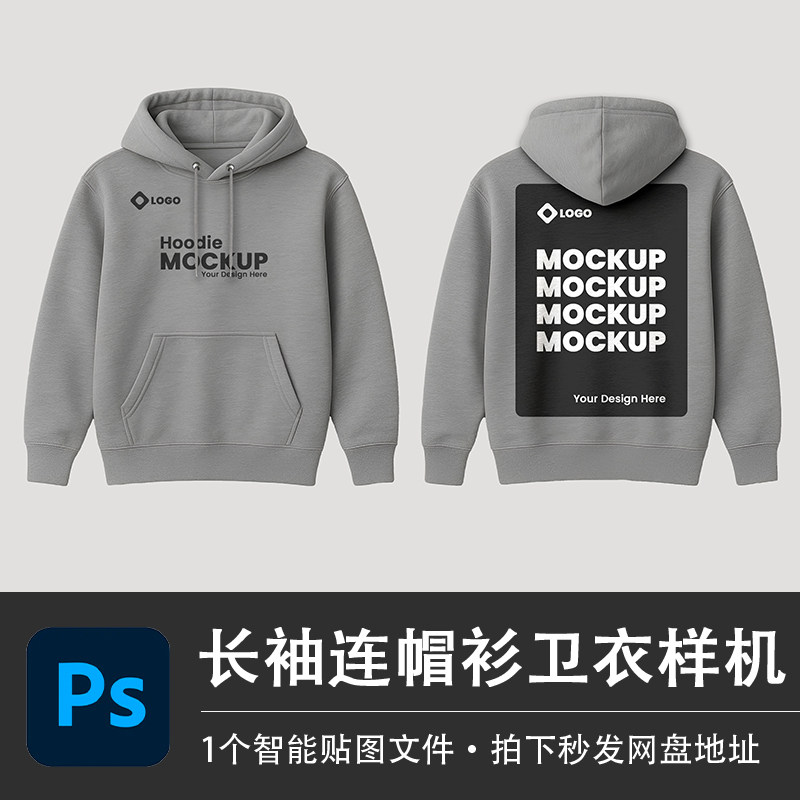 灰色连帽衫套头休闲运动卫衣正面背面PS样机模型智能贴图服装素材
