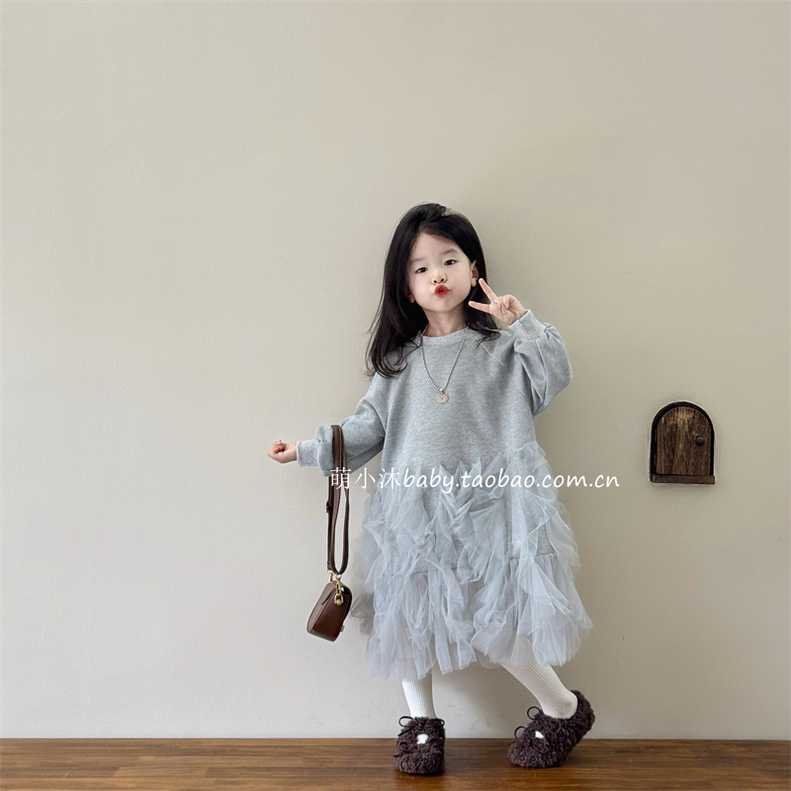 儿童洋气灰色连衣裙2025新款韩版女宝宝时髦卫衣拼接网纱公主裙潮