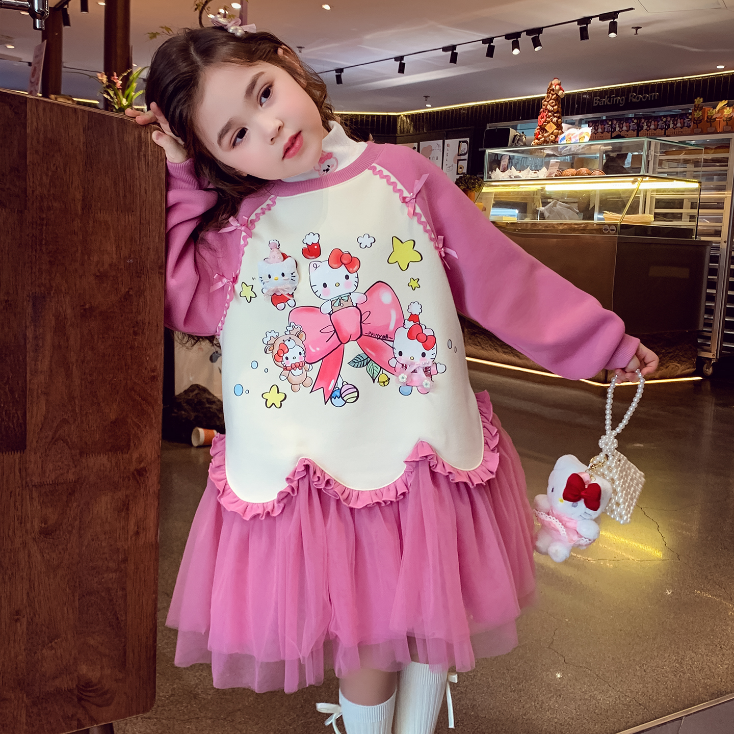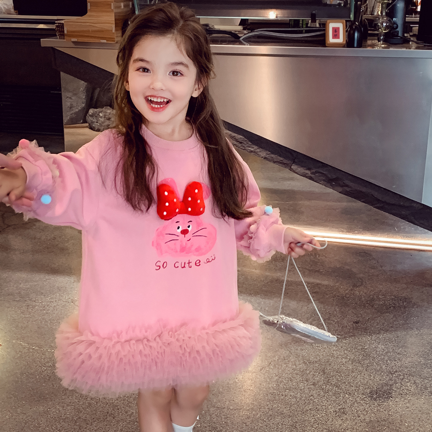 女童卫衣裙秋装2025新款儿童韩版蝴蝶结卡通网纱连衣裙小女孩裙子