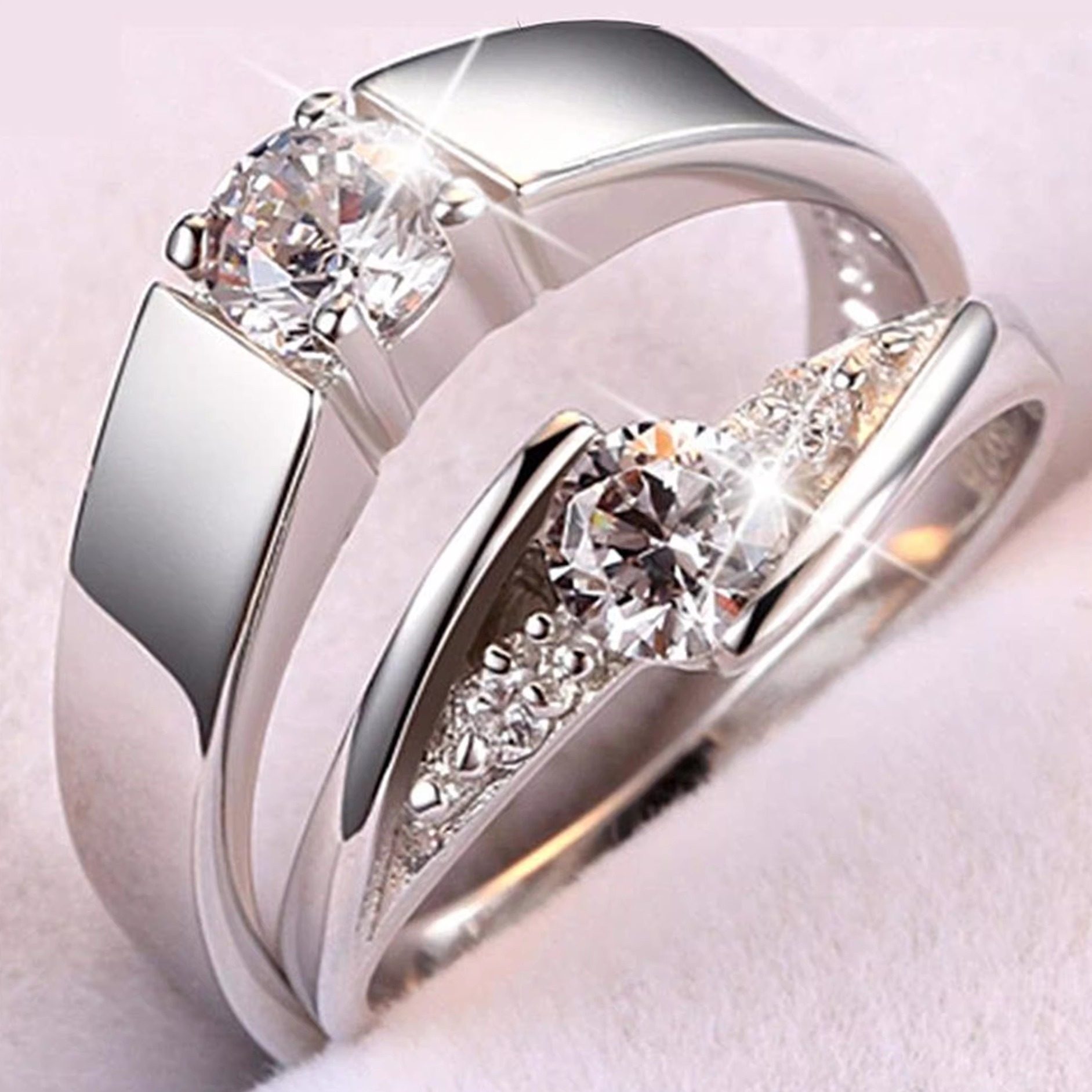 星织款扭臂微镶仿真莫桑石钻戒男女对戒奢华结婚戒指婚礼仪式道具