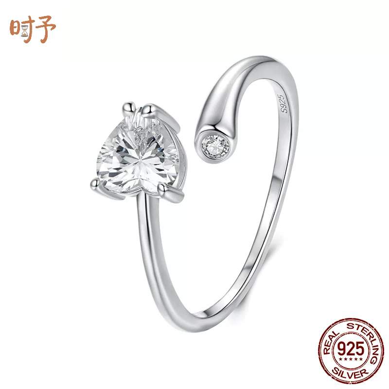 时予原创通体s925纯银爱心锆石开口戒指优雅奢华风可调节戒指婚戒