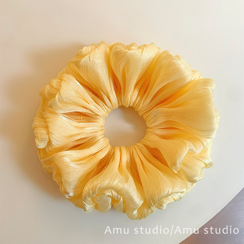韩国新款黄色缎面花苞褶皱大肠发圈高级感慵懒丸子头发绳扎发皮筋