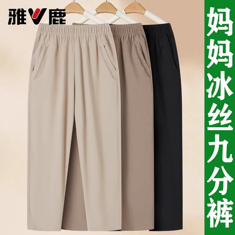 雅鹿妈妈裤子夏季薄款高腰冰丝九分裤中老年人女裤宽松直筒休闲裤