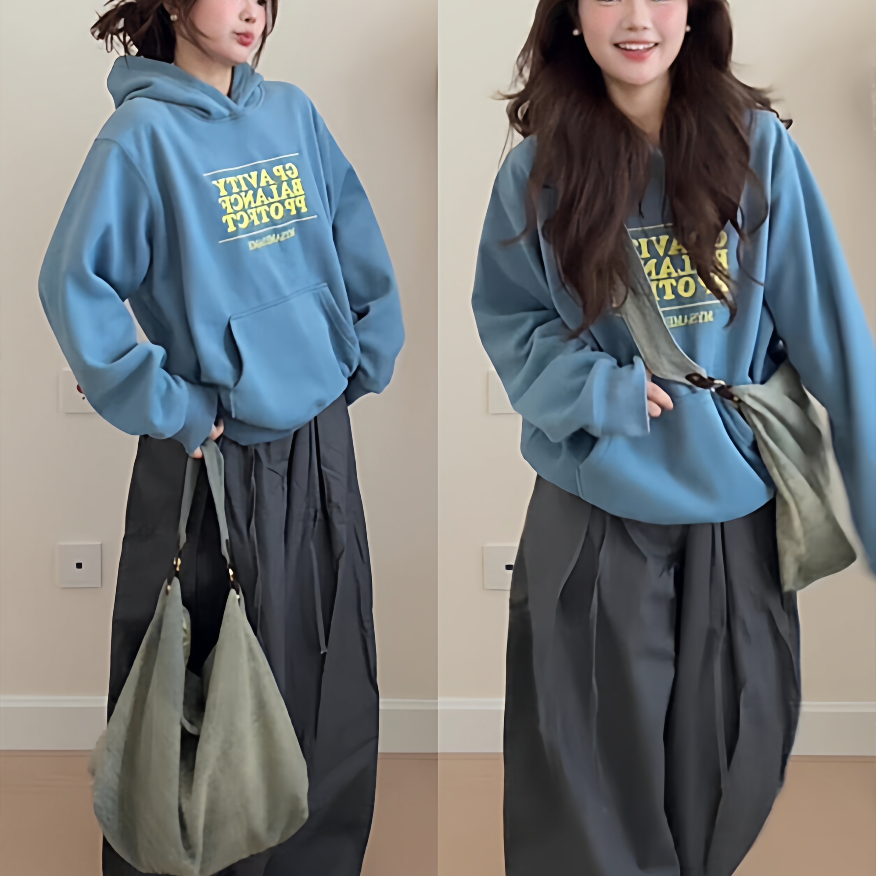 日系蓝色ulzzang卫衣女春秋新款宽松原宿风长袖学生oversize上衣