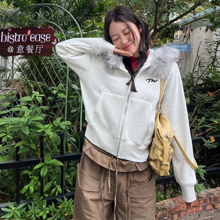 美式高街花灰色气质毛领连帽长袖卫衣女春秋宽松原宿风开衫上衣潮