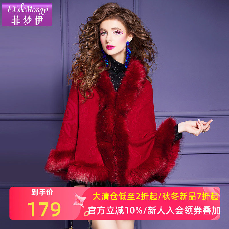 菲梦伊大毛领针织斗篷外套女冬季时尚高级感加厚保暖贵妇红色上衣