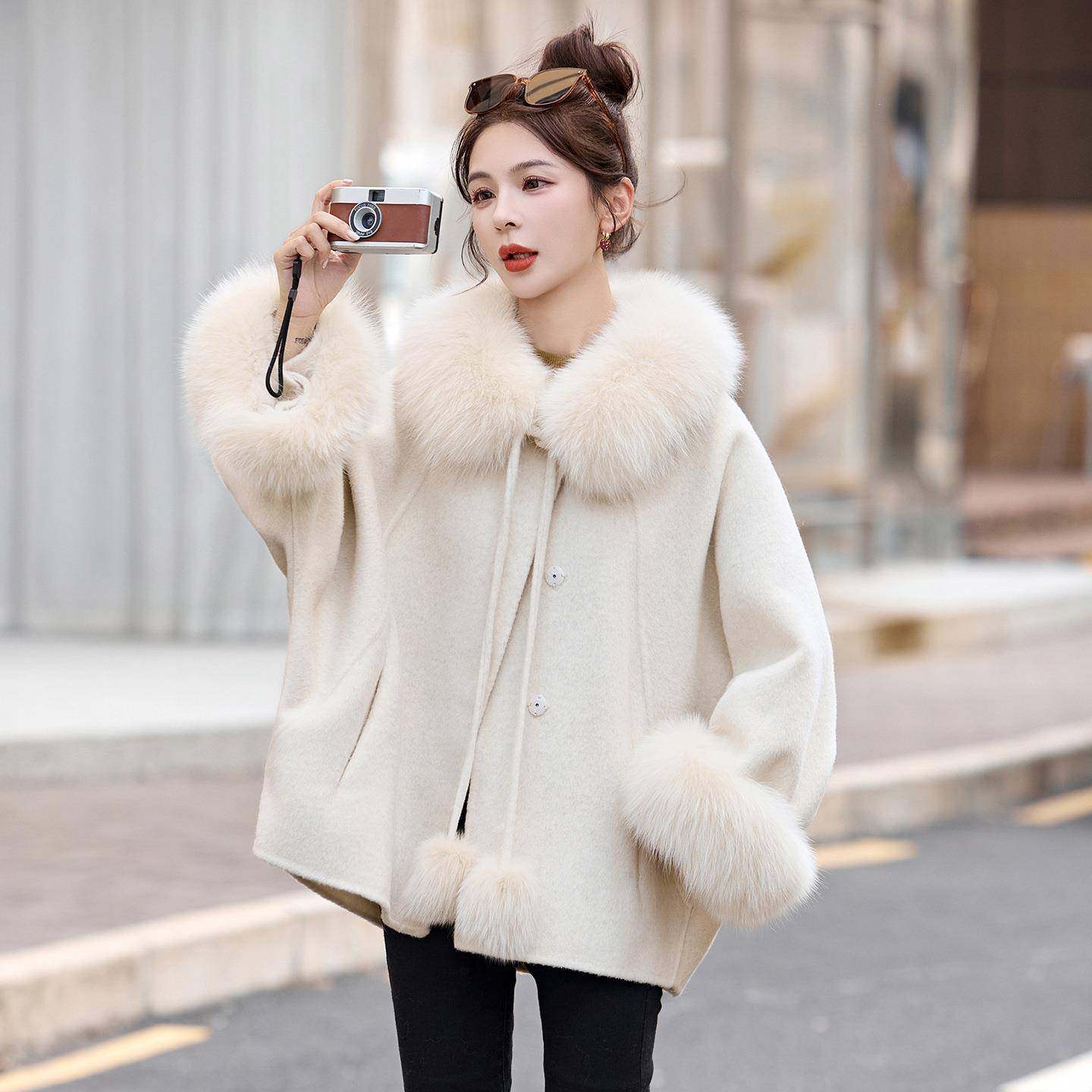 韩国东大门狐狸毛领围巾双面羊毛呢子大衣斗篷外套女阔版冬季新款