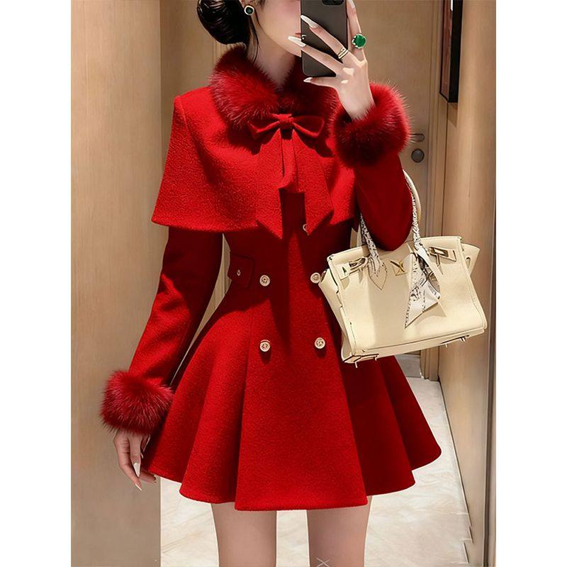 小香风红色披肩斗篷外套女冬季2025新款气质收腰显瘦连衣裙两件套