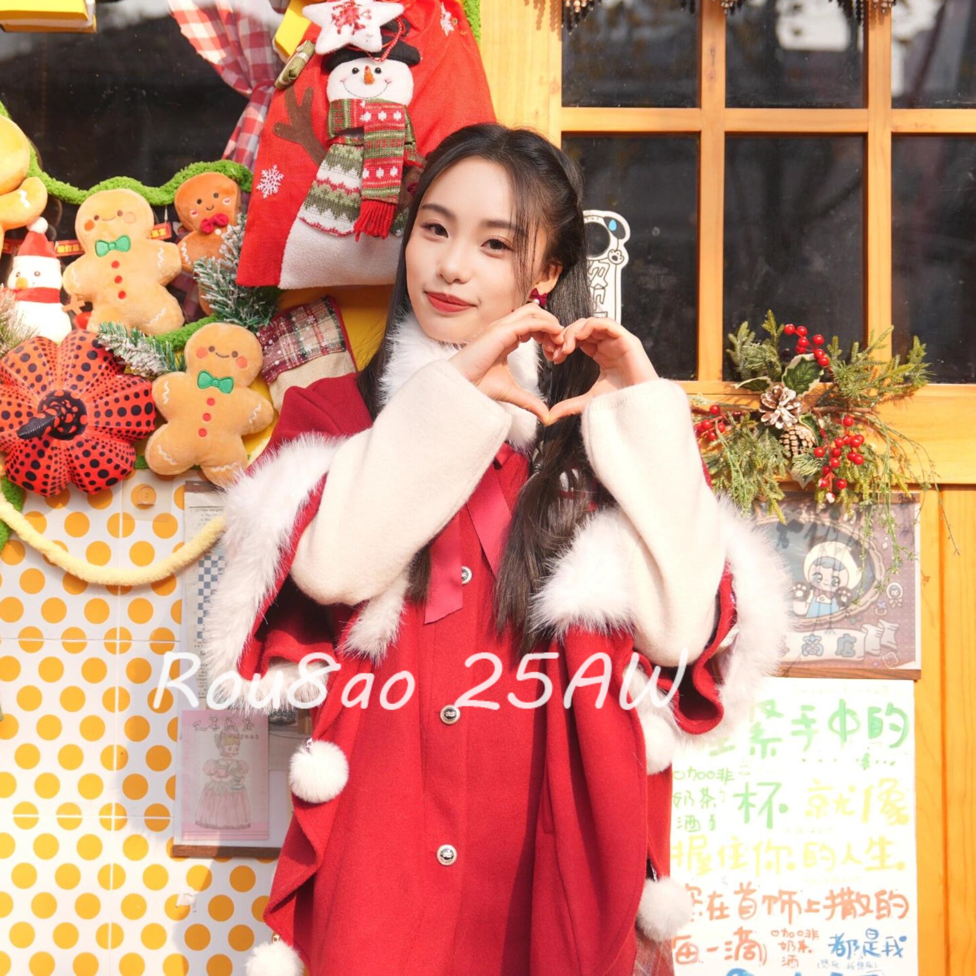 Rou8ao微胖大码女装千金风复古红色斗篷外套女冬圣诞新年穿搭战袍
