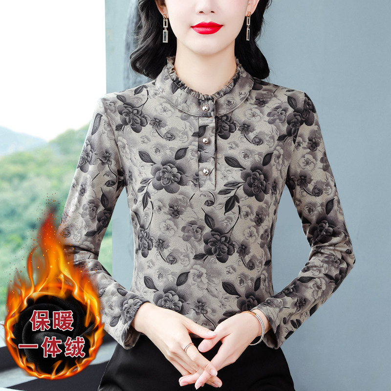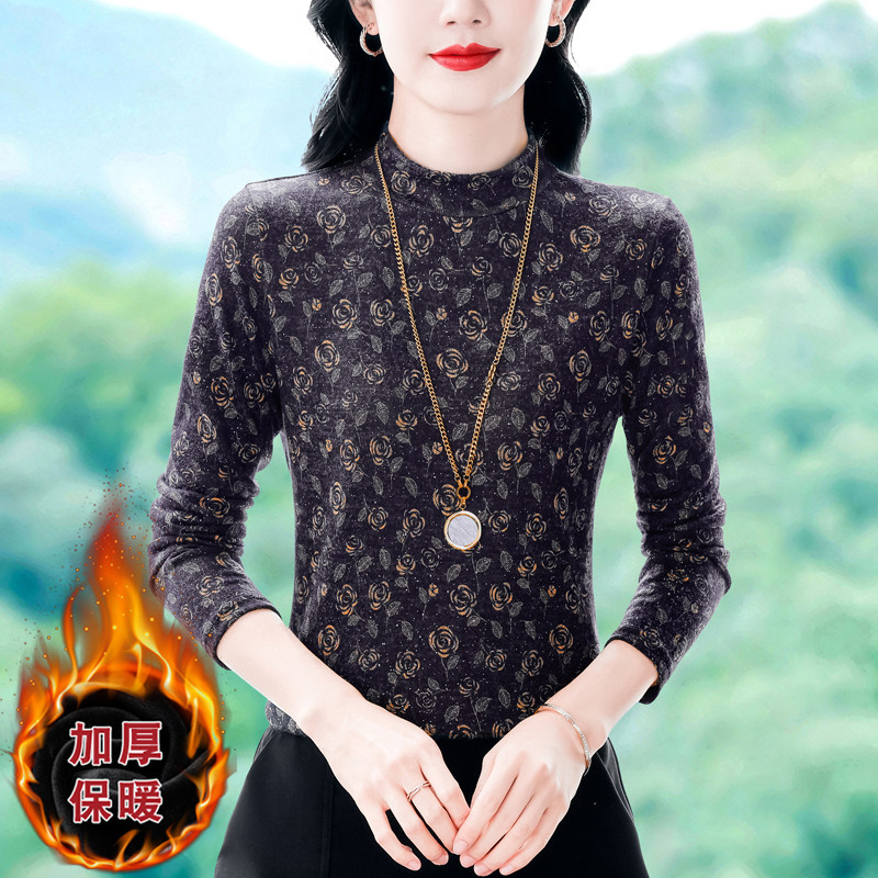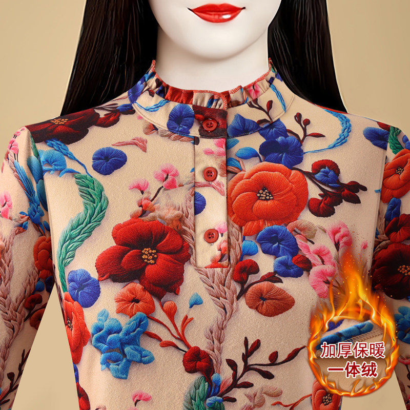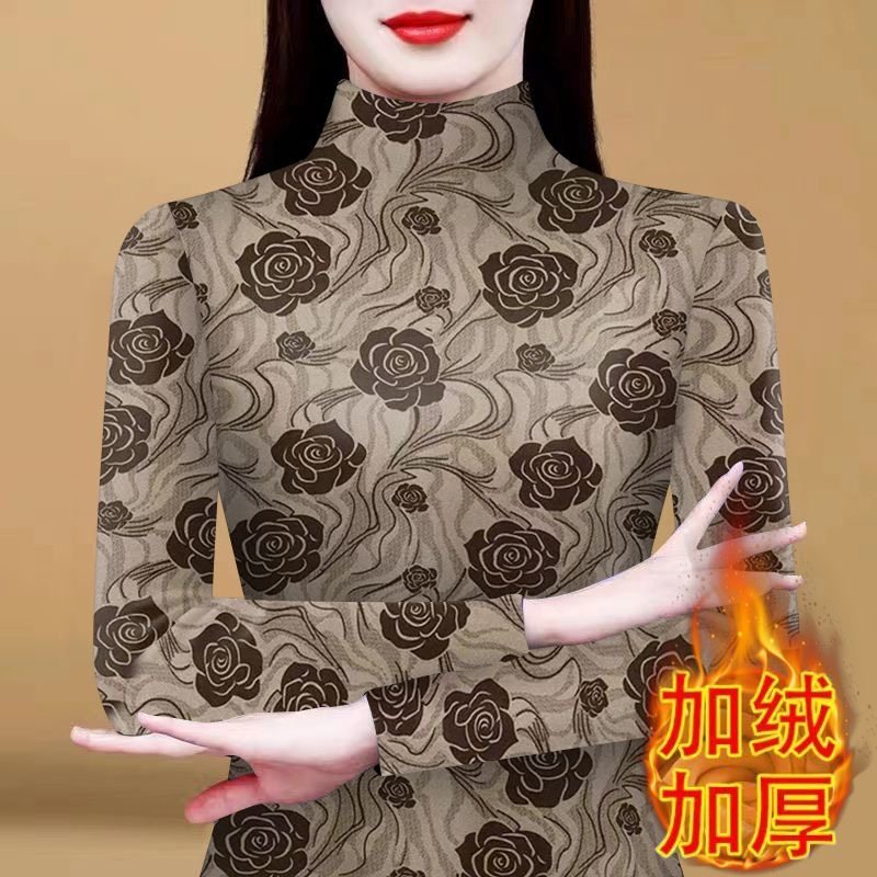 中老年妈妈保暖内衣女加厚加绒上衣秋冬季新款长袖内搭印花打底衫