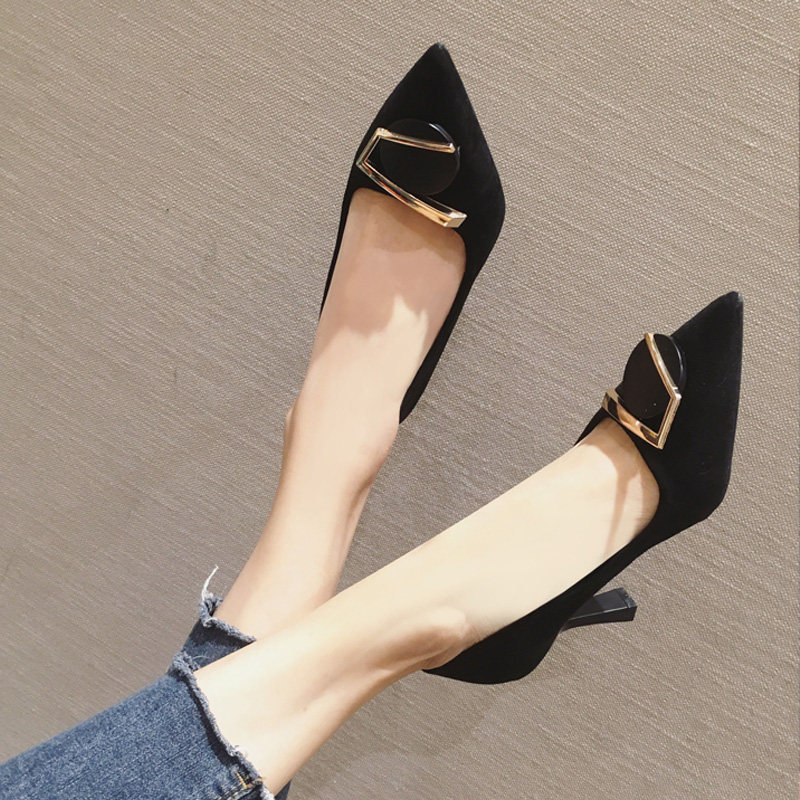 工作职业法式黑色尖头女鞋高跟鞋中跟5cm秋绒面单鞋新款气质礼仪9