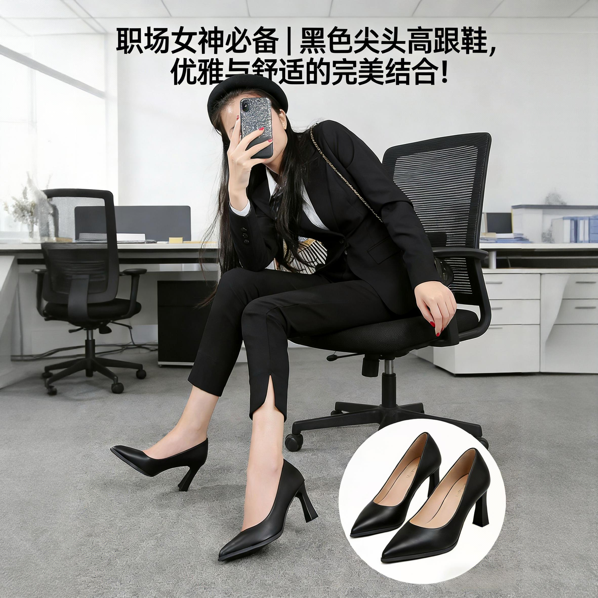 2026新款羊皮粗跟单鞋女尖头面试高跟鞋黑色正装职业中跟工作鞋女