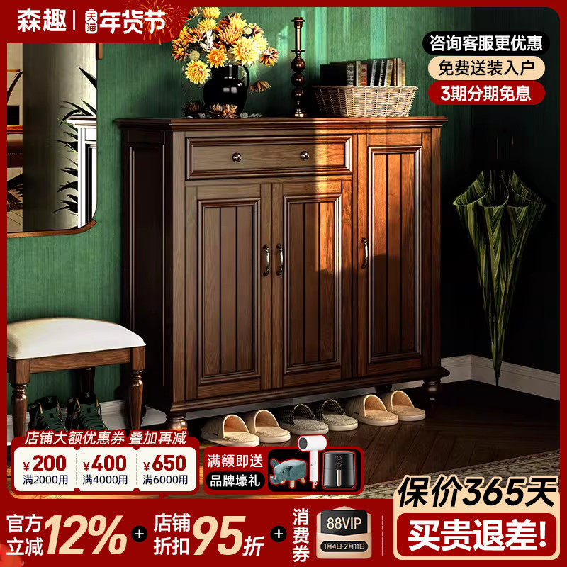 森趣美式复古全实木鞋柜入户进门收纳柜白蜡木两门三门多层玄关柜