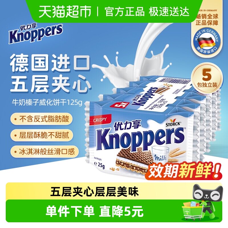 knoppers优力享威化饼干德国进口巧克力夹心零食休闲食品25g*5包