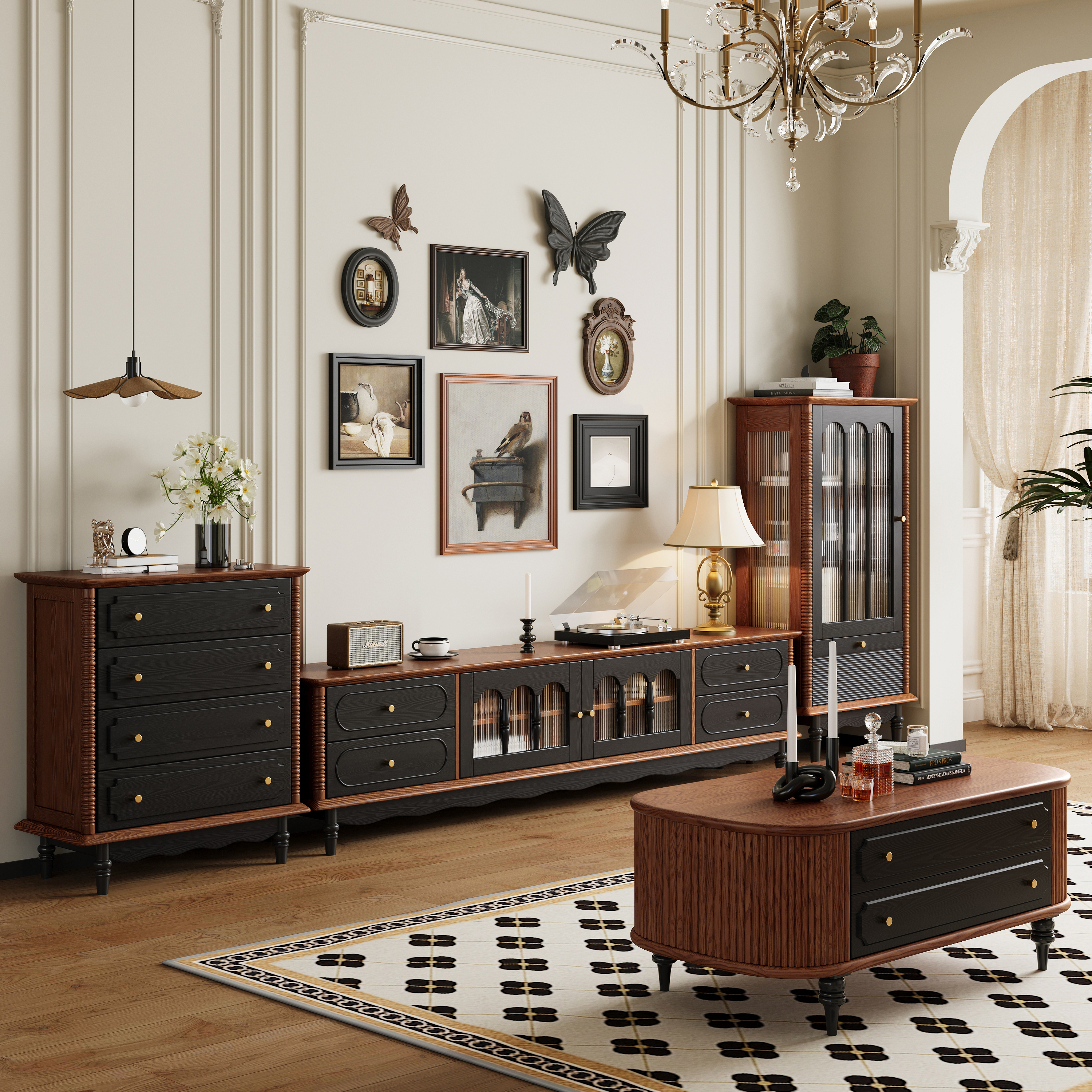 法式复古实木电视柜落地中古风收纳储物柜一体客厅茶几电视柜组合