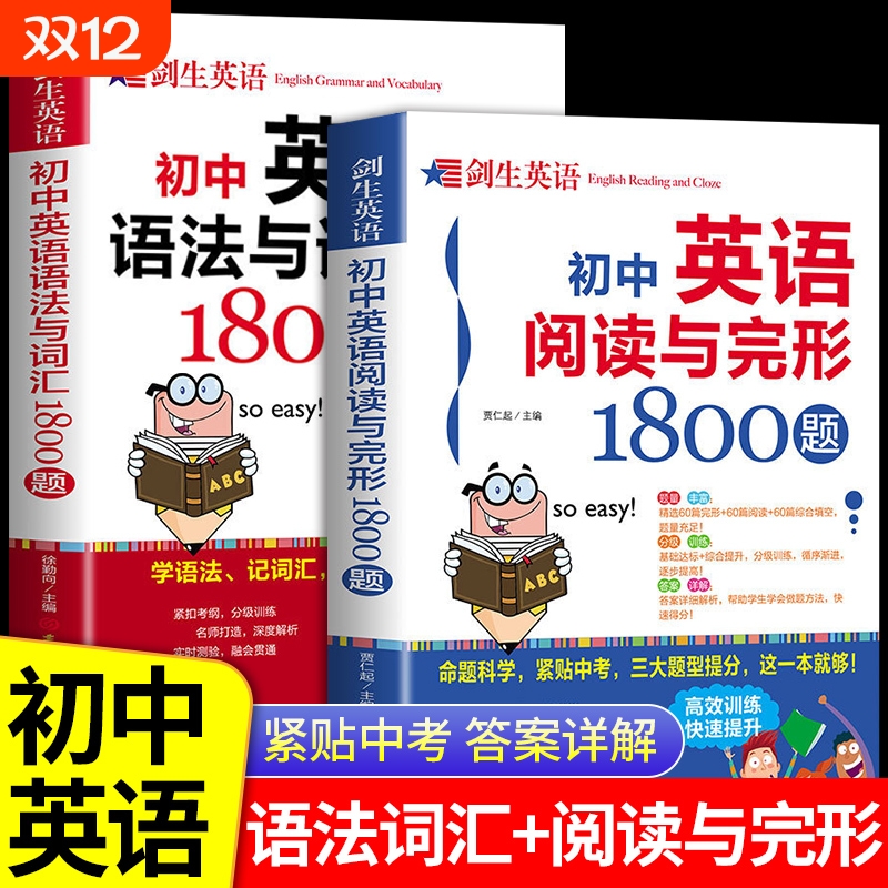 初中英语阅读理解与完形填空1800题 语法与词汇1800题中考英文单词听力专项训练七八九年级上册初一初二初三人教版资料全解