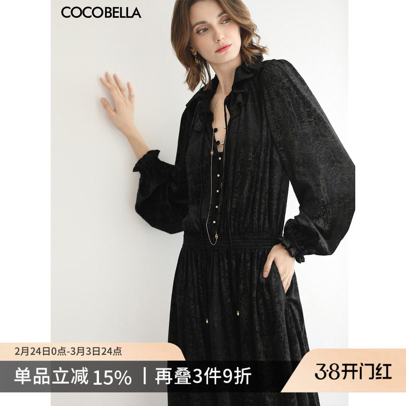 COCOBELLA复古压花烫金丝绒连衣裙荷叶收腰内搭长裙FR3239-2