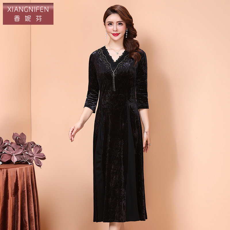 金丝绒拼接高端连衣裙秋冬妈妈装阔太太气质长款遮肉显瘦打底长裙